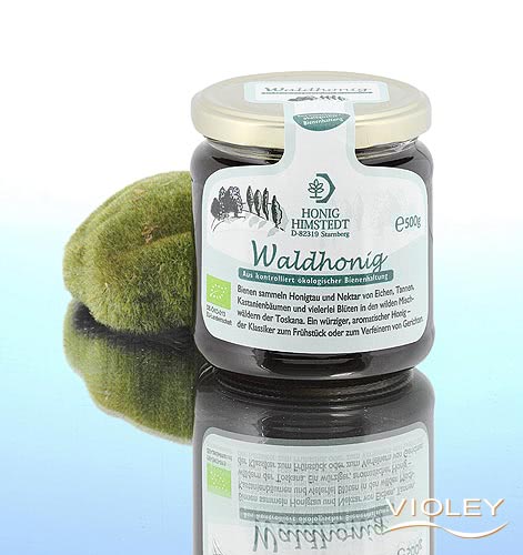 Honig Himstedt Organic Forest Honey in the 500 g glass. Bees gather honeydew and nectar from oak, fir and chestnut trees and other plants in the wild mixed forests. A full-bodied, aromatic honey. The breakfast classic. Also ideal for refining.