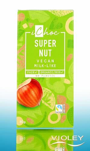 ichoc Super Nut. Discover a vegan organic alternative to classic nut chocolate. The bar features roasted hazelnuts, hazelnut paste and other ingredients. It gets its sweetness from beet sugar.