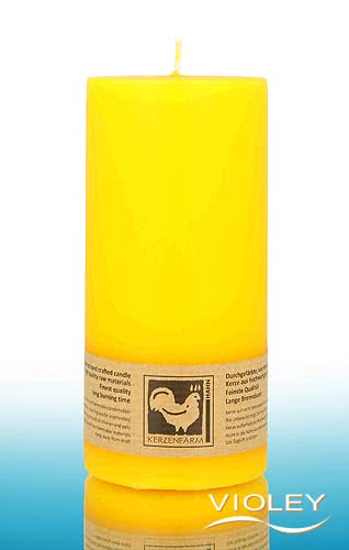 Kerzenfarm Hahn Pillar Candle Yellow 135 x 65 mm. The beautiful yellow pillar candle provides pleasant light and an atmospheric ambience. The quality paraffin waxes burn without residue. Kerzenfarm Hahn uses only selected wicks made of 100% cotton.