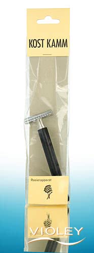 KostKamm safety razor cylindrical with handle made of waterproof lacquered black laminated Wood. Classic safety razor into which a razor blade can be inserted. Suitable for contours and longer beard hair. The cylindrical handle sits comfortably in the hand and supports smooth guidance. Suitable for standard razor blades, which can be changed quickly and easily.