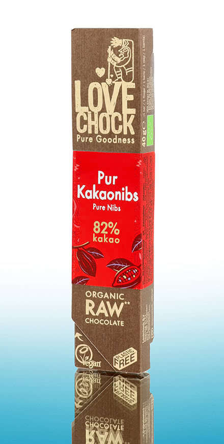 In chocolate production, cocoa is normally roasted and ground at high temperatures. However, the heat can cause many nutrients to change or be lost. For this reason, the temperature of Lovechock chocolates remains below 49 degrees Celsius during the entire processing time. This allows the original flavour of the cocoa bean to be transformed into a very special chocolate experience in a wide variety of flavours. Lovechock Pure Cocoa Nibs raw chocolate delights with large cocoa nibs and a strong cocoa flavour. The Lovechock Cherry and Chilli raw chocolate proves that the combination of cocoa and chilli doesn't just work in drinking chocolates. Lovechock Ginger Orange 69% is a vegan dark chocolate sweetened with dates, which owes its incomparable flavour to the tangy freshness of sun-ripened oranges and the pleasant spiciness of ginger. The Soul Caramel Sea Salt 75% bar is a fruity, tangy flavour experience based on cocoa butter. Dried dates and mulberries lend a fruity caramel note, while sea salt and cocoa provide a variety of flavours. Cocoa butter also forms the basis of the Alles Liebe Hibiscus Cocoa Nibs bar, which is refined with cocoa flakes and vanilla powder and gets its pink colour from hibiscus. Enjoy the invigorating chocolate flavours of the Maya and Aztecs with Lovechock, in between meals or during a coffee break.