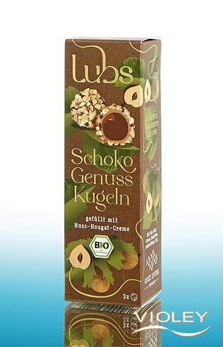 Lubs Organic Chocolate Balls. Three delicious pralines with a melt-in-the-mouth nut nougat filling for a little indulgence. Covered in milk chocolate and finely ground hazelnuts.