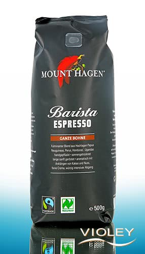 Mount Hagen Organic Barista Espresso. A brilliant blend of hand-picked coffee beans from organic farmers in Papua New Guinea, Peru and Honduras. The sun-dried coffee beans have been roasted slowly and gently. They are aromatic with hints of cocoa and nut.