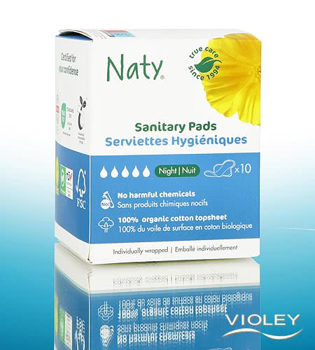 Naty Sanitary Pads Night. Sanitary pads made from compostable and plant based materials. The pack contains 10 pads. Feel safe and protected all night long.