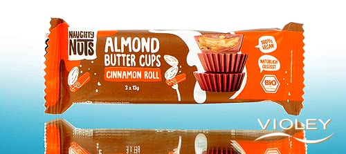 Naughty Nuts Almond Butter Cups Cinnamon Roll. These Butter Cups deliver the full flavour of cinnamon in a creamy cinnamon-almond butter filling, wrapped in melt-in-the-mouth chocolate. With roasted almonds, cashews and a subtle hint of cinnamon, naturally sweetened with coconut blossom sugar and dates - sweet, savoury and wonderful for snacking.
