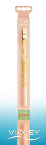 Niyok Bamboo Toothbrush Medium. Colour: Pink. The toothbrush has an ergonomically shaped handle made from rapidly regrowing bamboo. The multi-level bristles based on castor oil clean gently and are suitable for sensitive gums. The medium-firm bristles provide a thorough, clean feeling in the mouth.
