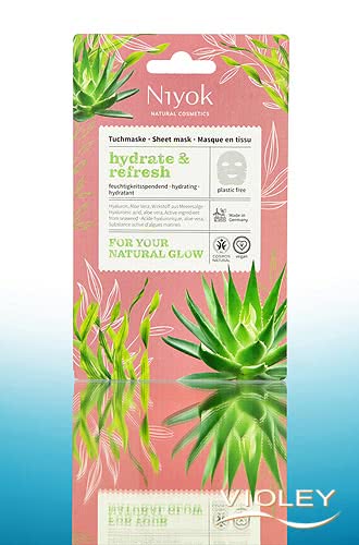 Niyok Sheet Mask Hydrate & Refresh. Instant freshness for your skin! Hyaluronic acid and aloe vera provide intensive moisture, visibly smooth the skin and make it appear plumper. Seaweed helps to reduce fine lines and support skin firmness.