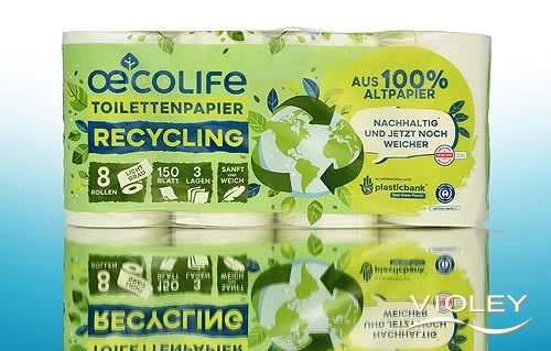 oecolife Recycled Toilet Paper. The pack contains 8 rolls of 150 sheets each of 3-ply toilet paper made from 100% recycled waste paper. The toilet paper has a pleasantly soft feel thanks to modern embossing technology and appears in a light grey colour.