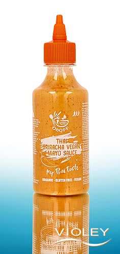 Onoff Organic Thai Sriracha Vegan Mayo Sauce. The authentically flavoured, vegan Sriracha mayo combines creamy mayonnaise with strong Sriracha for a spicy Thai flavour. Perfect for fresh spring rolls, grilled vegetables or barbecue skewers.