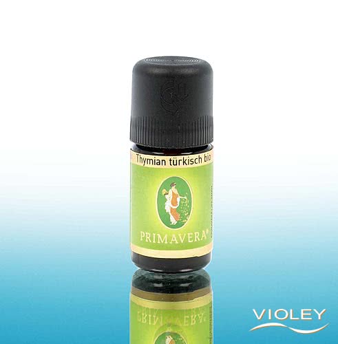 Primavera Thymian türkisch bio. Thyme is a perennial herb that is native to the Mediterranean. The variety thyme Turkish can get up to 1 meter high. In naturopathy thyme is used for colds, muscle and joint complaints and oral care. Primavera Thyme Turkish organic is a natural essential oil with a tart scent.
