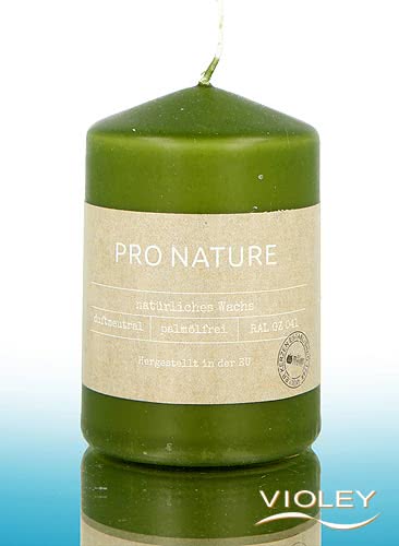 Pro Nature Stearin Pillar Candle 100 x 68 mm, green. In a pleasant, olive-green colour, decorative and elegant. This stearin pillar candle contains no palm oil and burns with a large, bright flame. Enjoy the warm light of a high-quality wax candle. Burns for approx. 20 hours.