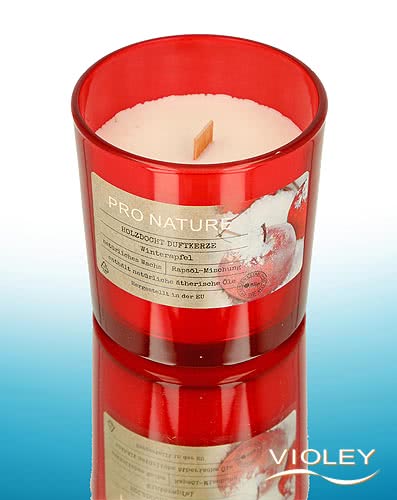 Pro Nature Scented Candle with Rapeseed Oil, Winter Apple. The wooden wick and red glass give this large scented candle a warm, Christmassy look. It is not only a real feast for the eyes, but with its mixture of natural waxes, it also spreads a wonderfully pleasant fragrance in the room that makes you think of the baked apple stall at the Christmas market.