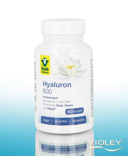 Raab Hyaluron 500. For skin, hair and nails. The capsules contain pure herbal hyaluronic acid, which is obtained from corn through a fermentation process, as well as vitamin C, zinc and acacia fibre. A daily portion of two capsules contains 450 mg of pure hyaluronic acid.