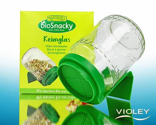 Rapunzel bioSnacky Glass germinator. Consists of a sieve, a glass germinator and an instruction manual. For the cultivation of sprouts, provides fresh and crunchy shoots all year round. Not suitable for cress and rucola / arugula seeds. Harvest your own fresh sprouts in only a few days. Fresh sprouts are delicious.