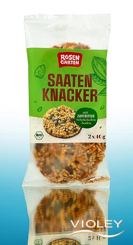Rosengarten Organic Seed Crackers. Crispy almond slivers, aromatic pumpkin and sunflower seeds, mildly nutty sesame seeds and a tart dark chocolate base. And all without flour. Enjoy a little energy boost in a practical duo pack.