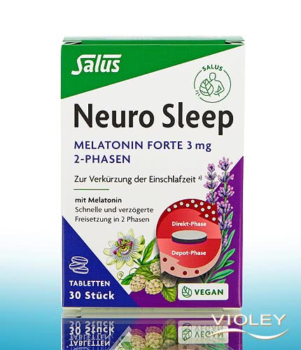 The Neuro Sleep Melatonin Forte 3 mg 2-phase tablets provide the body with 2 mg melatonin in the first, quick-release phase to shorten the time it takes to fall asleep. The second phase allows a gradual release of 1 mg melatonin over a period of several hours.