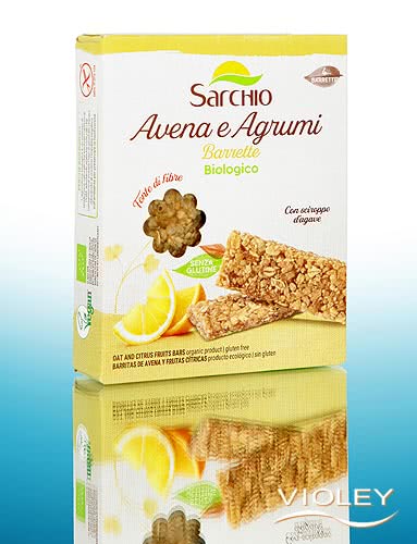 Sarchio Bio Barrette Avena e Agrumi in a pack of four. Simple, gluten-free oat flakes combine with the citrus flavour of orange and lemon to create a super tasty snack with a Mediterranean flair. A natural treat for a break, on the go or just in between.
