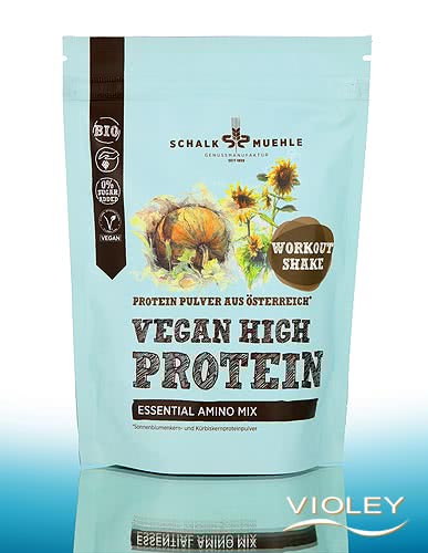 Schalk Mühle Vegan Organic High Protein Essential Amino Mix. Whether in muesli for breakfast, in a spread, as a shake before or after sport, in desserts or simply at work: the protein powder is a wonderful companion for an active lifestyle. Purely plant-based, it not only impresses with its 59% protein content, but also with its great flavour! Without added sugars ¹