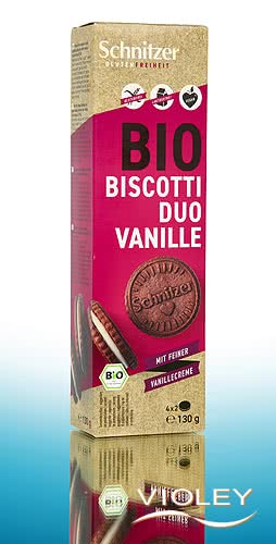 Schnitzer Organic Biscotti Duo Vanilla. Two crispy dark biscuits with a flavoursome vanilla cream filling. Perfect with coffee or as a sweet snack between meals. Enjoy the classic double biscuit in the gluten-free, vegan version.
