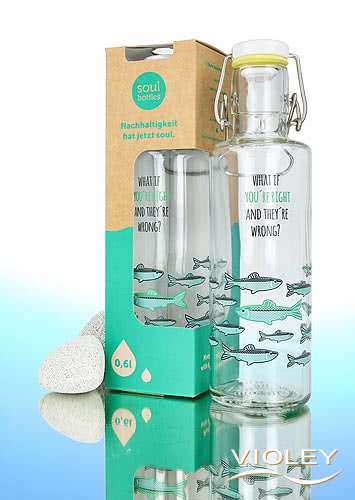 Soulbottles Glass Bottle 0.6 Litre You're right. This stylish drinking bottle has a porcelain lid and stainless steel handle and a capacity of 600 ml. A design with fishes and the sentence 'What if you're right and they're wrong?' adorns this glass bottle. A stylish companion for your everyday life.