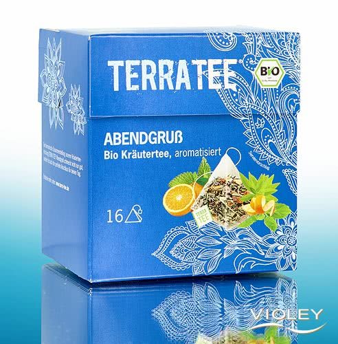 Terra Tee Evening Pour, Organic Herbal Tea, flavored. In this aromatic blend, tulsikraut and rooibos meet apple pieces, lemon balm leaves, and ginger. Lemon verbena, cinnamon bark, and orange peel elegantly round out the flavor. Manufactured from whole leaves and other ingredients. In a large pyramid bag for optimal aroma and flavor.