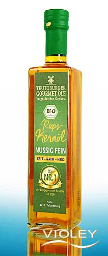 Teutoburger Gourmet Öle Organic Virgin Rapeseed Oil. Whether for cold dishes, cooking or frying - the rapeseed oil refines every dish with its slightly nutty note and is also heat-stable up to 180 °C. Enchant meals from all over the world with this fine gourmet oil from 1st cold pressing.