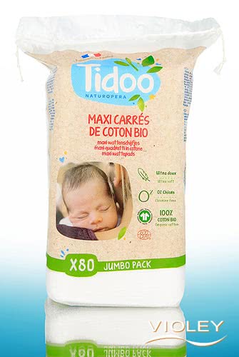 Tidoo Organic Cotton Maxi Pads in the pack containing 80 pieces. The pads made of 100% organic cotton are easy to handle due to their size and are suitable for both baby care and skin care. The firm pads do not fluff and do not split. The pads are resistant and will not pill or come apart.
