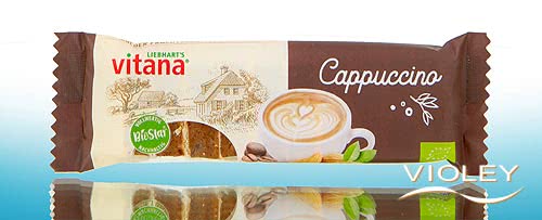 Vitana Organic Cappuccino Bar. This almond-based bar with honey, rice syrup, chocolate flakes and other ingredients is covered with a thin wafer on the top and bottom. The sweet snack is already cut into bite-sized pieces.