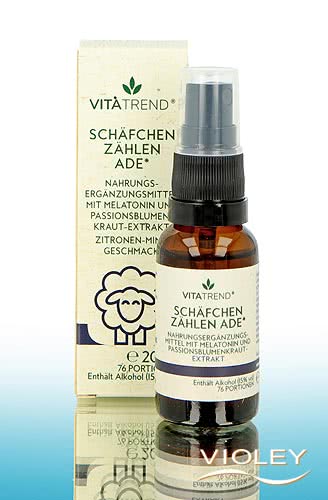 Vitatrend Schäfchen Zählen Ade Melatoninspray. The spray with the fresh lemon-mint flavour is a dietary supplement with melatonin and passion flower extract. Melatonin helps to shorten the time it takes to fall asleep. The positive effect occurs when 1 mg of melatonin is taken shortly before going to bed.