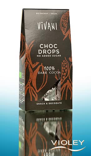 Vivani Organic Choc Crops 100% Dark Cacao. The Vivani bestseller Edel Bitter 100+ in a practical drop format. Enjoy dark chocolate flakes made from 100% organic Dominican cocoa with no added sugar. Versatile, e.g. for baking, as a decoration, for muesli or as a sugar-free snack.