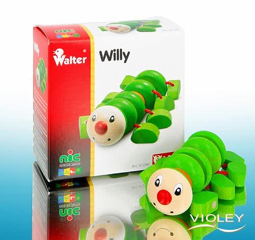 Walter Willy. Willy is a cuddly centipede, that can be bent and squeezed. The little feet are perfect for babies and children to grip. It stimulates creative playing and promotes the perception, the motoric development as well as the hand-eye-coordination. Walter Toys, manufactured and quality assured by nic, are made of top quality woods with partly handpainted surfaces and saliva-resistant paint (EN 71). Soft, round shapes, sturdily made, are suitable for children from 1-3 years old.