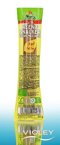 Wheaty Weenie Chorizo Snacker Vegan. A snack bar made from smoked seitan with a flavour reminiscent of a mild hot dog sausage. Super tasty in a roll with a little mustard - or just as it is, straight from the packet. To satisfy a small appetite or as a savoury snack between meals.