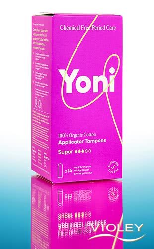 Yoni Tampons Super with Applicator. The tampons are made from 100% organic cotton and the applicator is made from recyclable cardboard. No plastic coating, synthetic ingredients or chemicals. The "Super" absorbency is suitable for days with moderate to heavy bleeding.