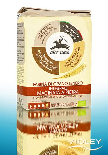 Alce Nero Organic Whole Soft Wheat Flour stone ground. Wholemeal flour made from Italian organic soft wheat, traditionally ground between millstones and therefore processed particularly gently. The slow stone grinding process does not heat the flour and thus preserves the valuable germ with its natural enzymes. The soft flour made from wheat grown in Emilia Romagna is ideal for bread, pizza, muffins, biscuits, homemade pasta and cakes and gives your baked goods a rustic flavour full of character.