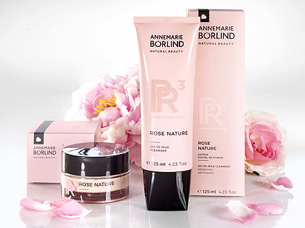 Rose Nature Oil-to-Milk Cleanser -puhdistusaineessa on erittäin tehokas öljygeelimäinen koostumus, joka liuottaa epäpuhtaudet, kuten meikin, hellävaraisesti ja perusteellisesti. Kevyesti viilentävä Rose Nature Blue Light Protection Spray antaa raikkaan hehkun puhdistuksen jälkeen. Rose Nature Supreme Glow Cream-Gel tukee ihoa myös kosteudella ja rauhoittavalla hoidolla. Yöhoitoon Annemarie BÖRLIND on kehittänyt uudistavat Rose Nature Night Repair -tipat. Rose Nature -silmänympärysvoide-geeli pehmentää silmänympärysalueen väsymysjuonteita ja saa silmät näyttämään säteilevän raikkailta. ANNEMARIE BÖRLINDin Rose Nature -hoitovalikoima tukee ihoa pionin, mustan metsäruusun ja aavikkoruusun kompleksilla stressiin liittyvää ihon ikääntymistä vastaan.