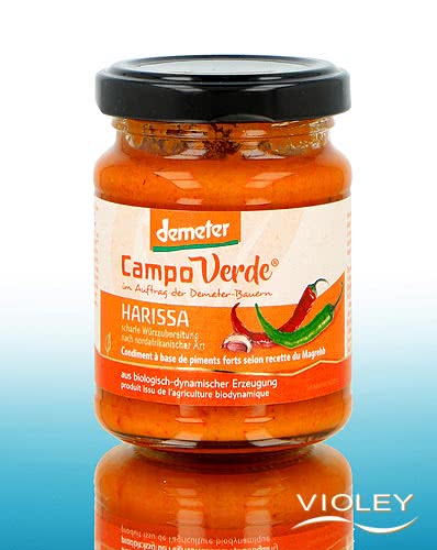 Campo Verde Luomu Harissa. 25 % chilipaprikoista valmistettu tulinen pohjoisafrikkalaistyylinen maustetahna. Harissa maistuu parhaimmalta puhtaana leivän päällä ja grillatun ruoan kanssa, mutta se sopii erinomaisesti myös kastikkeiden ja keittojen hienosäätöön.