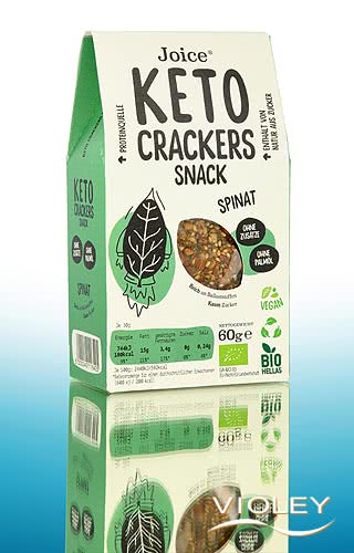 Joice Organic Keto Crackers Spinach. Unhulled sesame seeds, sunflower seeds, flaxseeds, and almond flour form the base of these vegan crackers. Pumpkin seeds, spinach, and onion powder round off the savory aroma. A spicy snack for in-between meals or on the go.