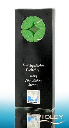 Kerzenfarm Hahn Palm Wax Teelights Vihreä. Puhtaasta luonnollisesta palmuvahasta valmistetut 10 teevaloa ystävällisessä vihreässä värissä tarjoavat romanttisia hetkiä ja tunnelmallisia aksentteja. Kerzenfarm Hahnin steariinikynttilät on valmistettu 100 % kasvisteariinista, joka on uusiutuva raaka-aine. Sitä saadaan pääasiassa Indonesiassa ja Malesiassa viljeltävien öljypalmujen massasta. Kerzenfarm Hahn steariiniteekynttilät palavat nokeettomina ja tippumattomina hiljaisella liekillä.