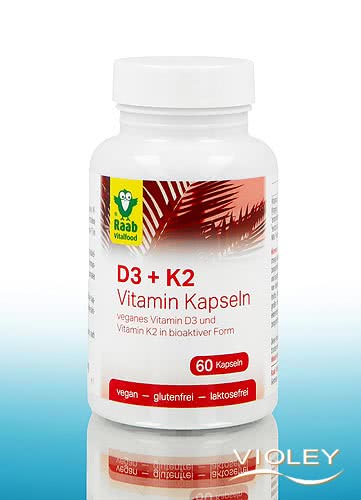 Raab D3-vitamiini + K2. Kapselit sisältävät vegaanista D3-vitamiinia (kolekalsiferolia) ja vegaanista K2-vitamiinia (menakinoni-7), joka on tuotettu käymällä bioaktiivisessa all-trans-muodossa. D-vitamiini edistää normaalin lihastoiminnan ylläpitämistä ja immuunijärjestelmän normaalia toimintaa. K-vitamiini edistää normaalin luuston ylläpitoa.