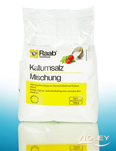 Raab Kalium Salt Blend suuressa 1 kg:n pakkauksessa. Mineraalisuolaseos, joka sisältää natriumkloridia (ruokasuolaa) ja kaliumkloridia. Käytä Raabin kaliumsuolaseosta tavallisen ruokasuolan korvikkeena kaikissa ruokalajeissa ja aterioissa.