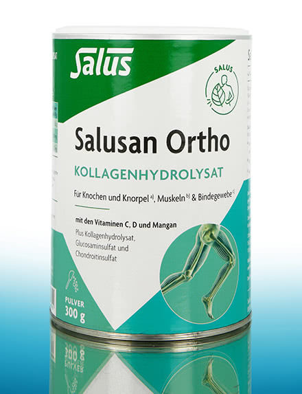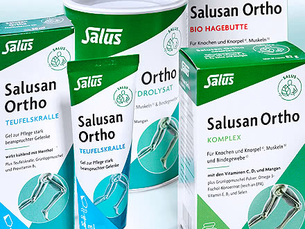 Salusan Ortho Devil's Claw -geeli, jonka aktiiviainekompleksi koostuu viherhuulisimpukasta, afrikkalaisesta pirunkynsistä ja mentolista, viilentää ja virkistää nivelvaivoja hierottaessa. Mauton ja helposti liukeneva Salusan Ortho kollageenihydrolysaattijauhe sekoittuu hyvin kylmään mutta myös lämpimään ruokaan ja juomaan. Salusan Ortho luiden, rustojen, lihasten ja sidekudoksen tukemiseen on saatavana myös kapselimuodossa. Arvokkaaseen villihedelmä- ja yrttisekoitukseen perustuvaa Salusan Ortho Luomu ruusunmarjatonikkia suositellaan 30 ml:n päivittäisenä yksikkönä aterioiden jälkeen.