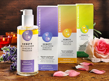 Käsittely fluidisessa oskillaattorissa synnyttää uudenlaisen aineen laadun, joka ymmärretään kannustimena vastakohtien yhdistämiseen ja tasapainon löytämiseen. Hierontaöljyissä ja vartalovoiteissa jalostettuna uusi misteli voi edistää harmonisointia ja stimuloida itseaktivoitumista. Sonett Mistelformin hieronta- ja hoitoöljyissä ja -voiteissa yhdistyvät mistelin voima ja luomu-kasviöljyjen ravitsevat ominaisuudet - miellyttävää tunnetta iholla, johon liittyy eteeristen öljyjen luonnollinen tuoksu. Hemmottele ihoasi rauhoittavalla hoidolla, jossa on mistelin harmoninen luonne.
