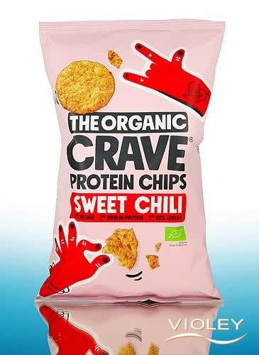The Organic Crave Proteiinisipsit Sweet Chili. Nämä rapeat sipsit on valmistettu höyrytetyistä linsseistä. Auringonkukkaöljy, valkosipuli ja chili antavat niille ominaista makua. Jännittävä vaihtoehto klassisille perunalastuille. Jaa niitä tai napostele niitä itse.