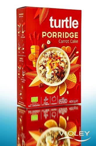 Turtle Organic Porridge Carrot Cake. For a heartwarming start to the day. Pieces of dates, candied orange peel, roasted hazelnut pieces, and pieces of carrot and apricot give this porridge its distinctive flavour. The carrot cake aroma is harmoniously rounded off with cinnamon. Just the thing for anyone who loves a warm breakfast. Porridge Carrot Cake is also enjoyable cold with fresh milk or yoghurt.