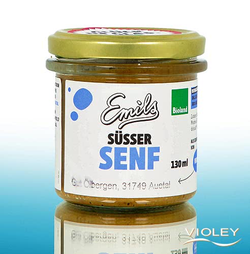 Moutarde douce biologique Emils. Cette moutarde doit sa saveur fruitée et sucrée à la douceur naturelle des poires, des pommes et des raisins. Que ce soit pour tartiner des sandwichs et des wraps, pour tremper des légumes ou des bretzels, comme base d'une vinaigrette aigre-douce ou comme marinade pour les légumes grillés: la moutarde douce est si polyvalente qu'elle ne se marie pas seulement avec la saucisse de veau.