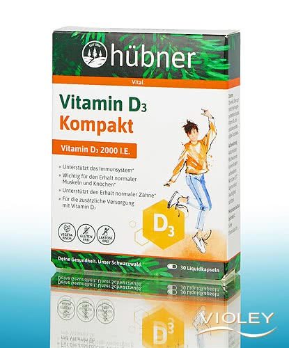 Hübner Vitamine D3 Compact, Gélules. Complément alimentaire sous forme de gélules liquides pour l'apport supplémentaire de vitamine D3. Pour soutenir le fonctionnement normal du système immunitaire. La vitamine D est souvent appelée "vitamine du soleil".