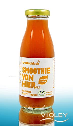 kraftschluck Smoothie Biologique Rhubarbe Carotte Gingembre. La carotte, la rhubarbe et le gingembre forment un mélange harmonieux de saveurs sucrées, acides et agréablement épicées. En combinaison avec la rhubarbe, la carotte apporte une douceur équilibrée, tandis que le gingembre complète merveilleusement le profil de saveur avec son arôme rafraîchissant et épicé.