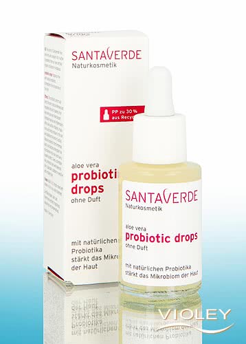 S SantaVerde Aloe Vera Probiotic Drops sans parfum. Le sérum soutient la peau. Le pur jus d'aloe vera et l'hydrolat de tilleul apaisent les irritations, tandis que l'acide hyaluronique fixe l'humidité. Des probiotiques naturels issus de bactéries lactiques fermentées soutiennent l'effet positif. Convient particulièrement aux peaux sensibles et irritées.