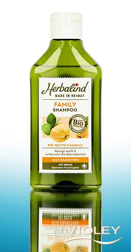 Herbalind Shampoo Family Organic Quince & Camomile. The vegan, mild care formula with plant-based, moisturising sugar building blocks and quince gently cleanses and supports the moisture balance of the hair and scalp. The hair becomes noticeably smooth and easy to comb.