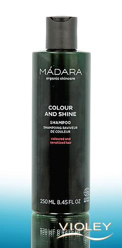 Mádara Shampoo Colore e Lucentezza . Per capelli colorati o evidenziati. Con estratti di semi di lino nordico, ippocastano e piantaggine. Deterge delicatamente, rafforza e leviga. Aiuta a ripristinare la lucentezza naturale dei capelli.